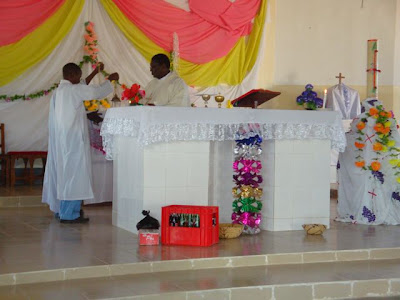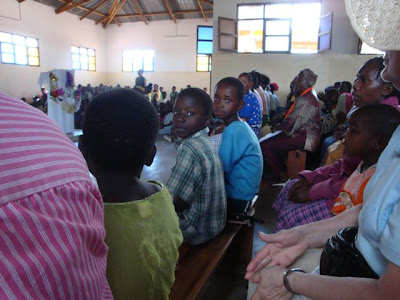 Our second day at Ussongo involved much church attendance! Father Chuwa has two masses at the home parish, and then goes to two mission parishes. Father Joachim presides at up to another four missions. It is amazing to see the faithful come out in such numbers. The first mass at Ussongo is at 6:45 am, and is mainly attended by the students of the school. 650 teenagers – boys on one side, girls on the other – all in school uniforms, is quite a sight. The second mass is attended by the villagers. The women are all decked out in their most colorful, fashionable outfits, and the choir is amazing. This is the inside of the church, before mass.