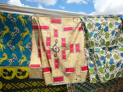 …to buy a kanga! Kangas are the pieces of cloth that African women use for absolutely everything – for clothing, for wrapping and carrying babies, for sheets, for balancing pails of water on their heads – you name it, they do it. And so when we went to the outdoor market, I was not surprised to see many, many kangas for sale. And lots of other stuff, too. Shoes (made from old tires!), cattle, pots and pans, chickens, jewellery, dried fish, clothes (sewn on old treadle machines right out in the open) and the list goes on. It made for some pretty colorful photos.