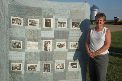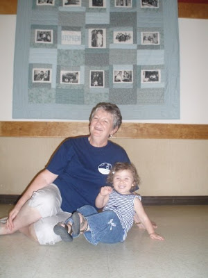 After we got home and finished up all the painting and mowing and trimming and gazebo-building (pictures coming later!), it was time for the Schan-a-thon festivites to begin. My mom’s family hasn’t had a reunion in 13 years, so there was much hugging and reminiscing and laughter. A wonderful three days of reconnecting. Mom and Lisa came a bit early to help with the preparations. Here’s mom showing off the incredible quilt she made for the silent auction.