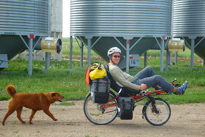 And just to make this post a little bit longer, I must tell you about the visitors we had on Tuesday. A couple came into the library to use the internet. We got chatting, and it turns out they are returning to their home in Ottawa after an around-the-world, 15-month cycling trip. I invited them out for supper and to stay overnight, and we had a great visit. You can read more about them on their blog, www.goingeast.ca. Here are a few shots of Scott and Becky with their recumbent bikes.